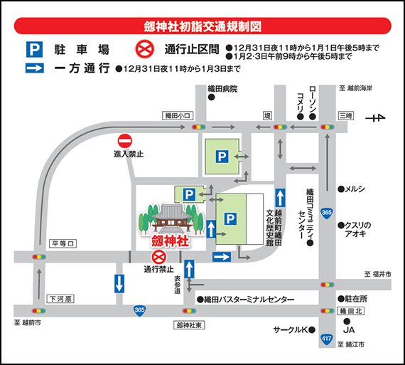 神社周辺は混雑が予想され、下記の通り交通規制が実施されますので、ご参拝の折は、ご理解ご協力をお願い致します。 尚、シャトルバスの運行等はございません。何卒ご了承ください。