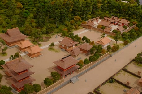 ※この古絵図は、室町時代後期の劔神社の様子を示すものと考えられている。境内の北には本殿を始め末社や神楽堂など神社関係の建物が配置され、南には神宮寺である織田寺関係の建物が多数あり、神仏習合の様子を知ることができる。
